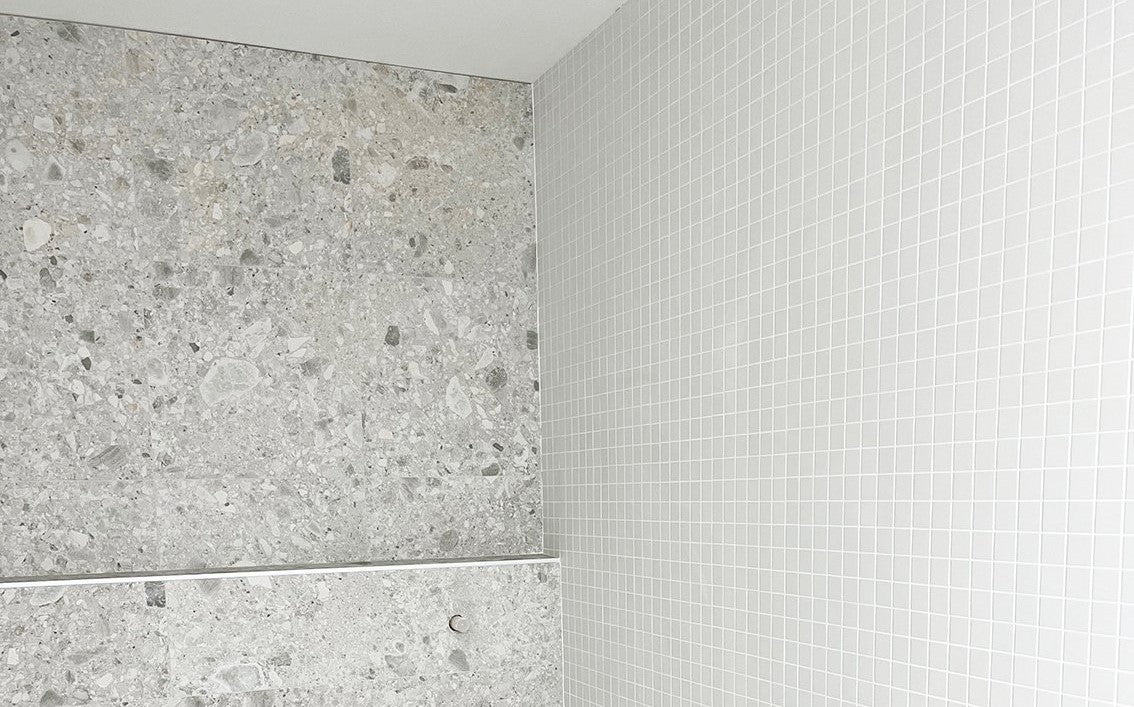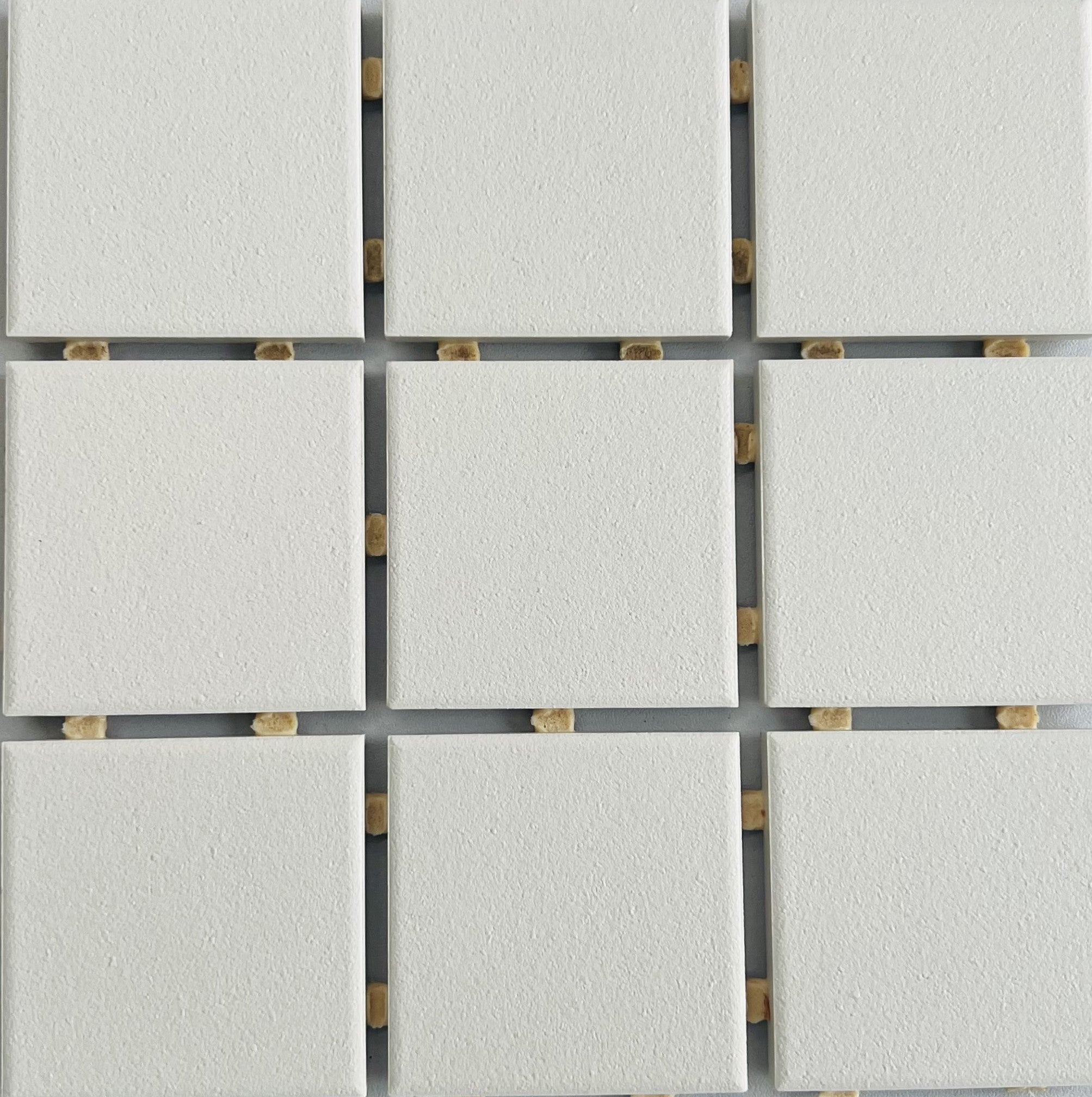 The Suki range of full body porcelain tiles. is frost proof, suitable for floor and wall, ok for swimming pools. Antislip finish. Each tile is 4.8×4.8cm mounted on 30.6×30.6cm sheet. The dot mounted mosaics are particularly suitable for swimming pools because they allow full adhesion of the adhesive to the back of the tile. Perfect for showers and wet areas.